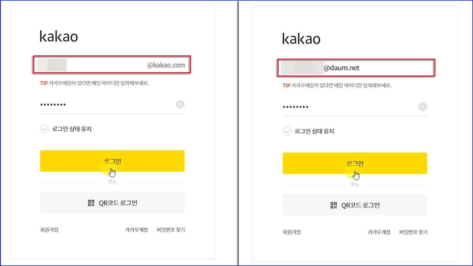 '카카오계정'이나 '다음 이메일 주소'로 로그인 할 수 있습니다.