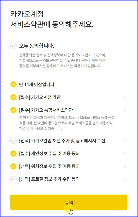 필수 항목들을 모두 선택한 후 [동의]를 클릭합니다.