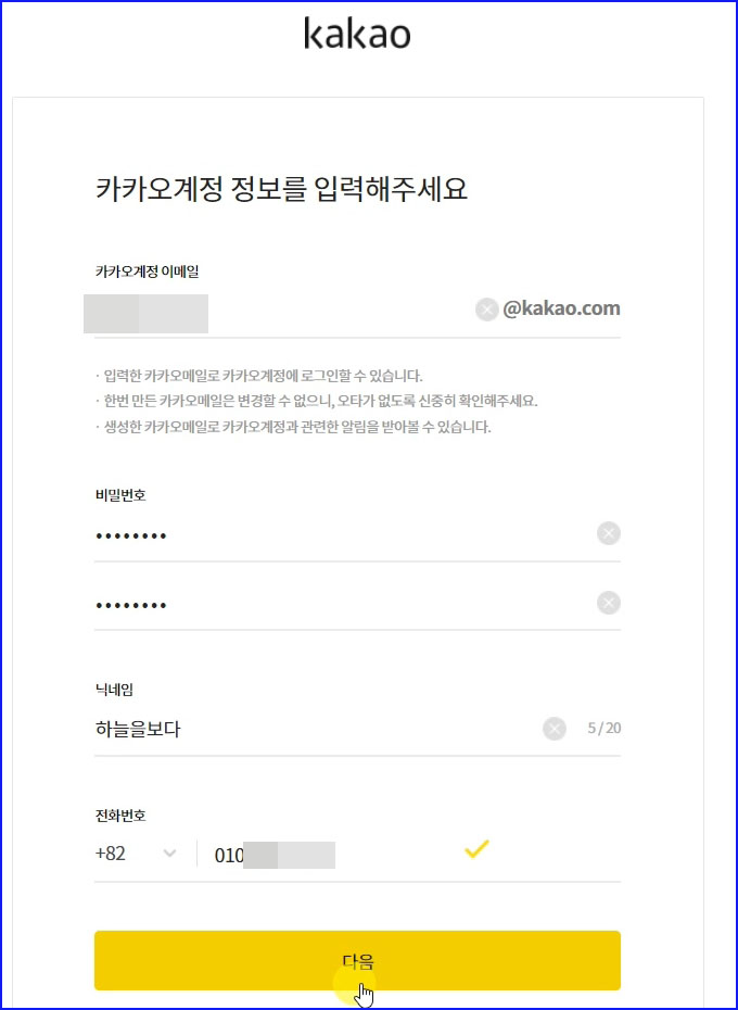 5. '카카오계정 정보 입력' 화면이 나타나면