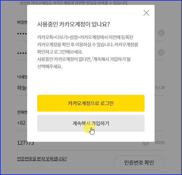 7. '사용중인 카카오계정이 있나요?' 팝업창에서