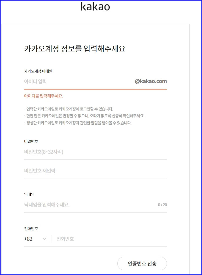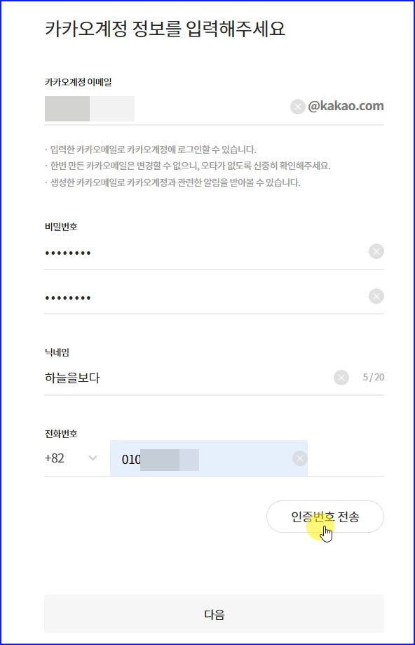 카카오계정 이메일, 비밀번호, 닉네임을 입력하고,